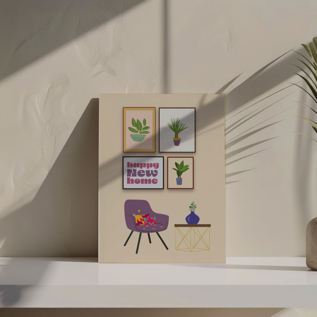 Celebrate the joy of a new home with this stylish and modern "Happy New Home" greeting card. Featuring chic illustrations of indoor plants, wall art, and cosy décor, it’s the perfect way to congratulate friends, family, or loved ones on their new beginning. Printed on premium eco-friendly paper, this card is both thoughtful and sustainable. The blank interior offers ample space for a personal message to make your wishes even more special.