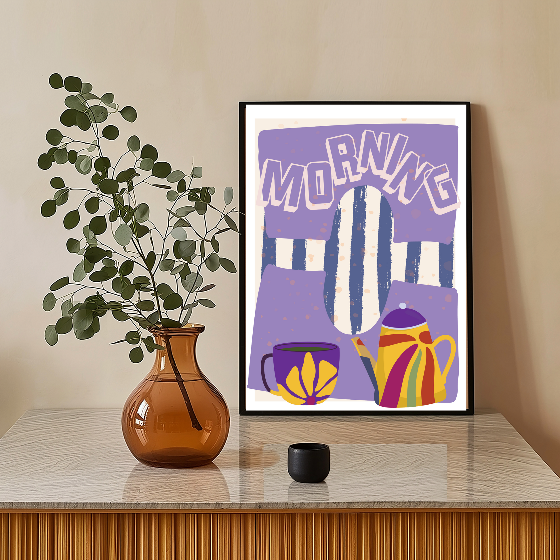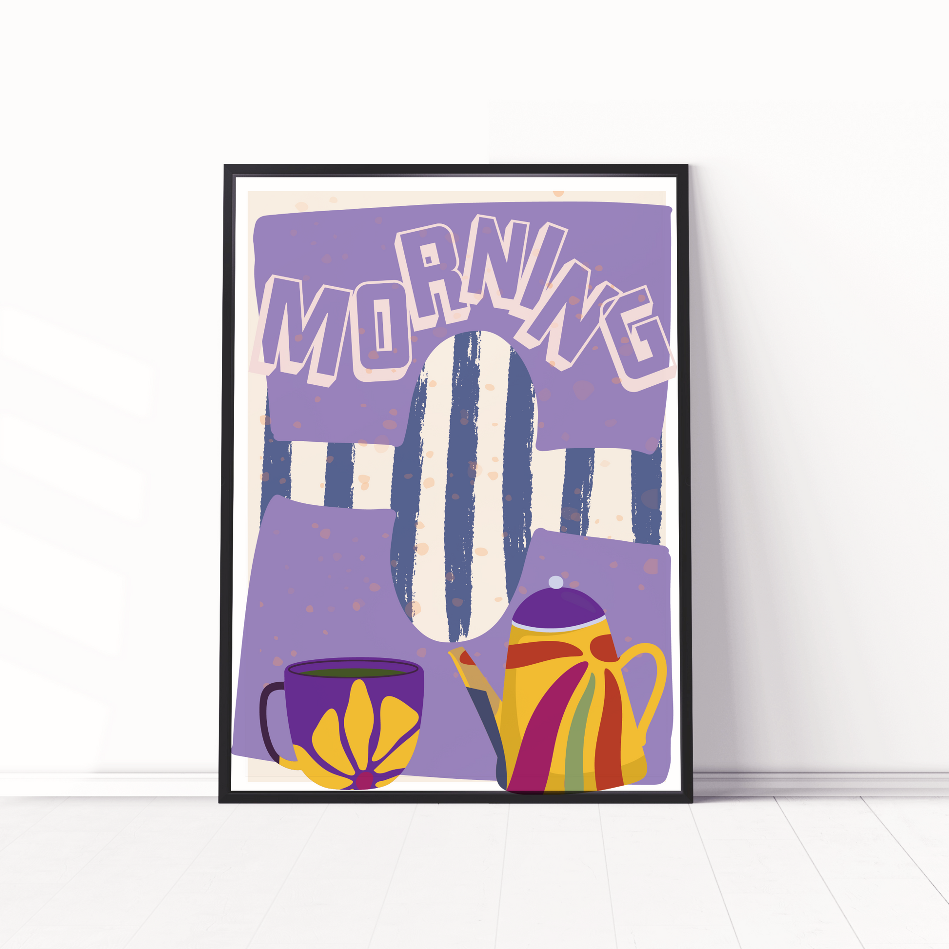 Brighten your mornings and elevate your space with the Morning Bliss Abstract Wall Art Print. Featuring a cheerful purple backdrop, bold typography, and a vibrant teapot and mug design, this artwork captures the cosy essence of your favourite morning ritual. It's the perfect décor piece to energize your kitchen, dining area, or breakfast nook.