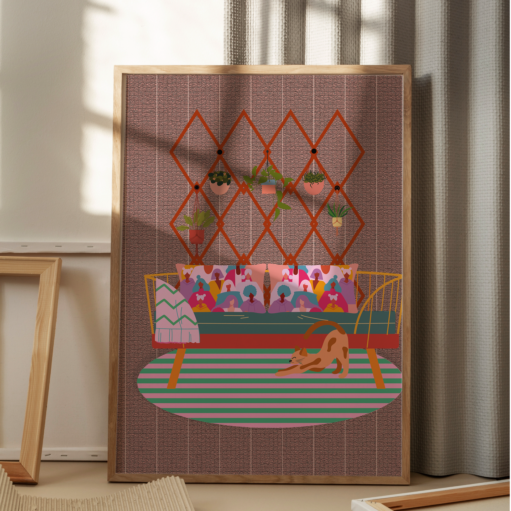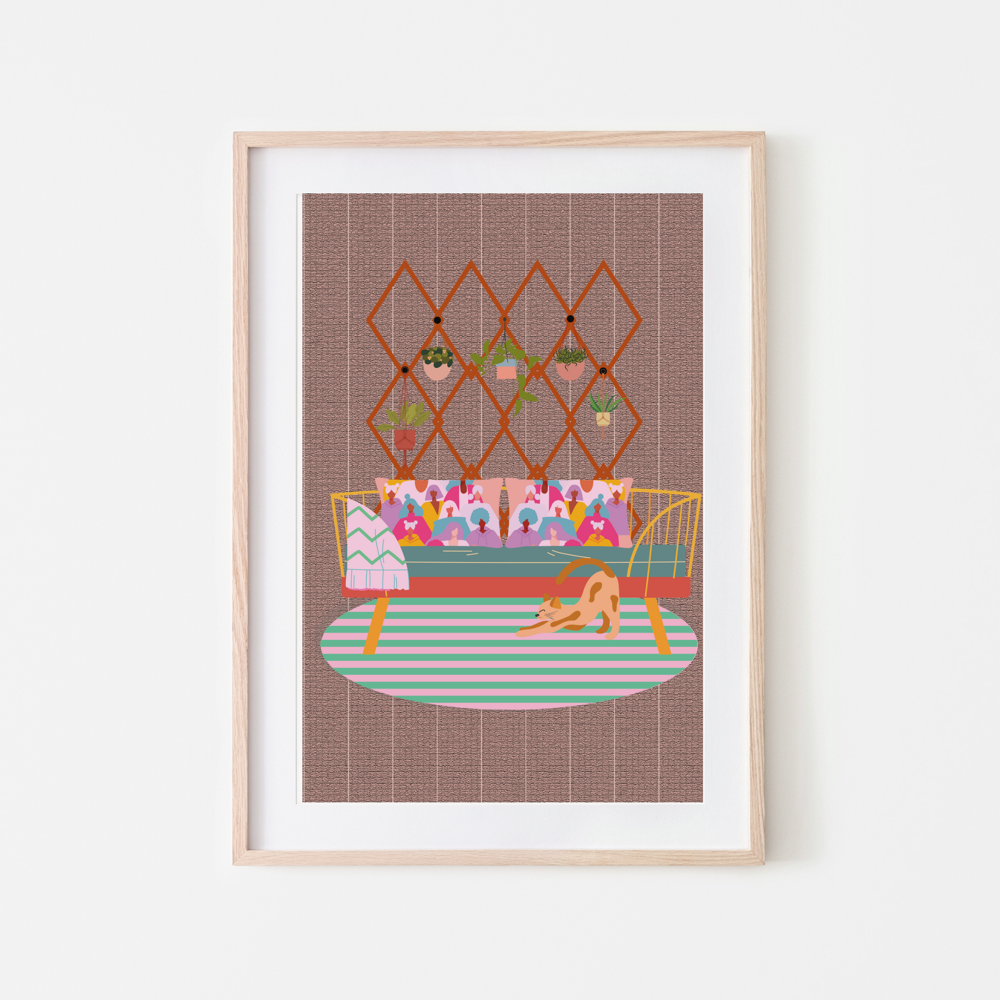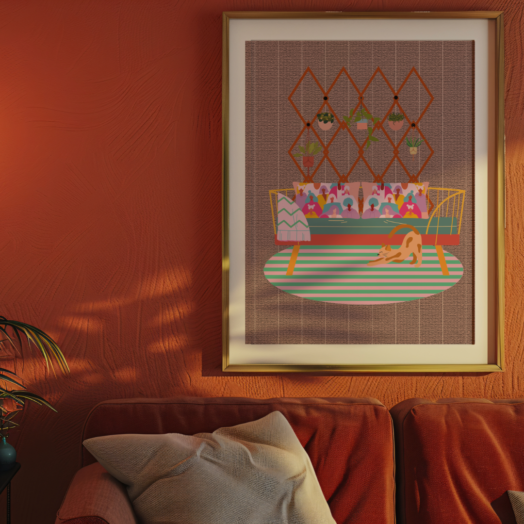Create a peaceful and inviting atmosphere with our "Serene Haven" Wall Art Print, featuring a stylish rattan sofa adorned with modern decorative cushions, a playful cat stretching out on a circular rug, and lush plants hanging gracefully on the wall. This design beautifully captures a tranquil living space, perfect for those who appreciate comfort and nature-inspired interiors.