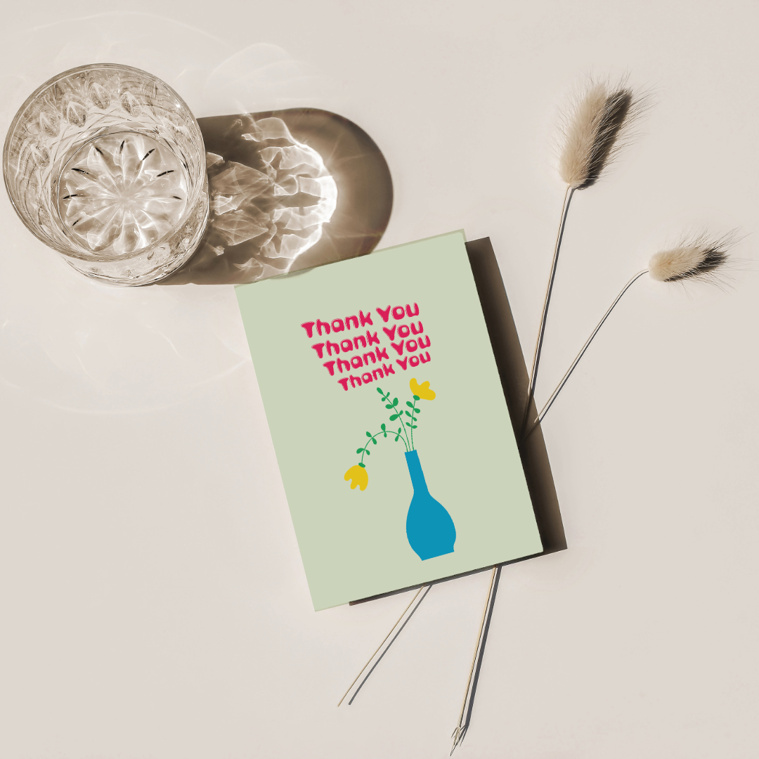 Show your appreciation with our chic "Thank You" floral greeting card! Featuring a modern design with vibrant yellow flowers in a bold blue vase and playful typography, this card makes saying thank you stylish and memorable.