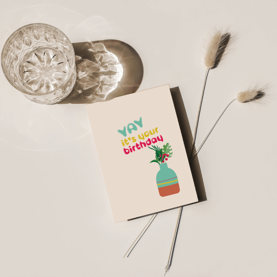 Celebrate birthdays in style with this cheerful "Yay, It’s Your Birthday" greeting card! Featuring a minimalist design with vibrant typography and a cute vase illustration, this card is the perfect way to brighten someone’s special day.