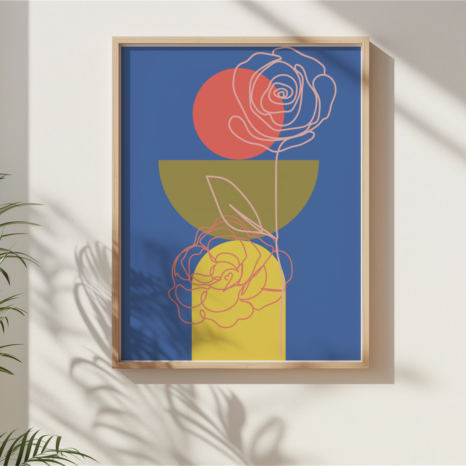 • Print 1 – Rose Balance: A stacked geometric composition with a line-drawn rose, coral sun, olive bowl, and golden vase on deep blue